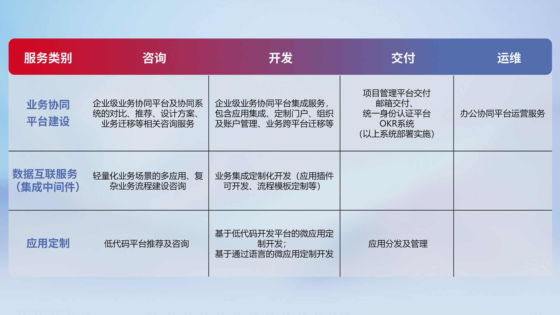 针对钉钉、、企微、、、IDaas等平台级产品提供产品的规划、、、方案、、、交付、、、定制化开发等服务,,,实现如统一协同办公、、、智能客户服务、、、、混合会议管理、、、、智能数据查询、、、、等业务场景,,实现数字化转型。。。