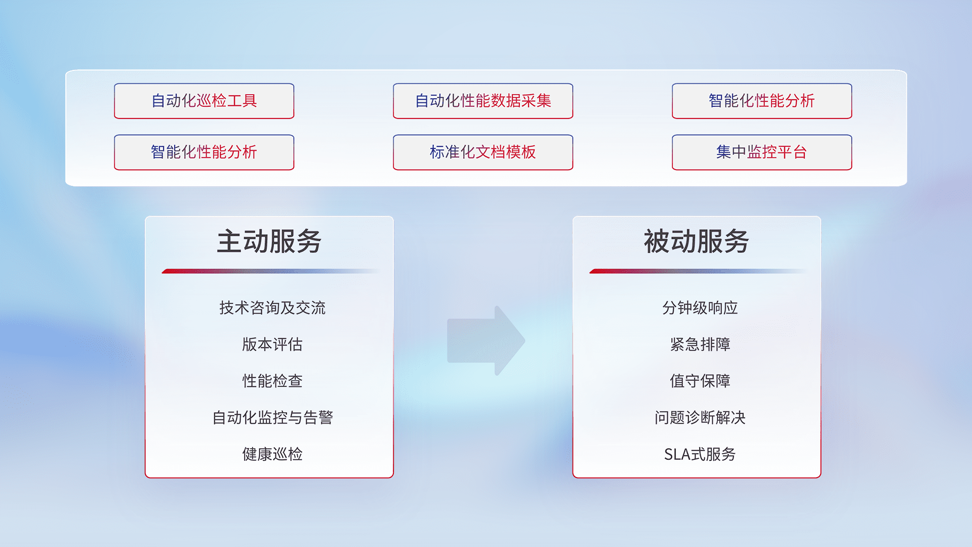 智能化工具和标准化文档,,,,保障服务质量,,提供主动服务(包含技术咨询、、、、版本评估、、、、性能检查、、自动化监控与告警、、、、健康巡检)和被动服务包含(分钟级响应、、、、紧急排障、、值守保障、、、、问题诊断解决、、、、SLA服务)。。。